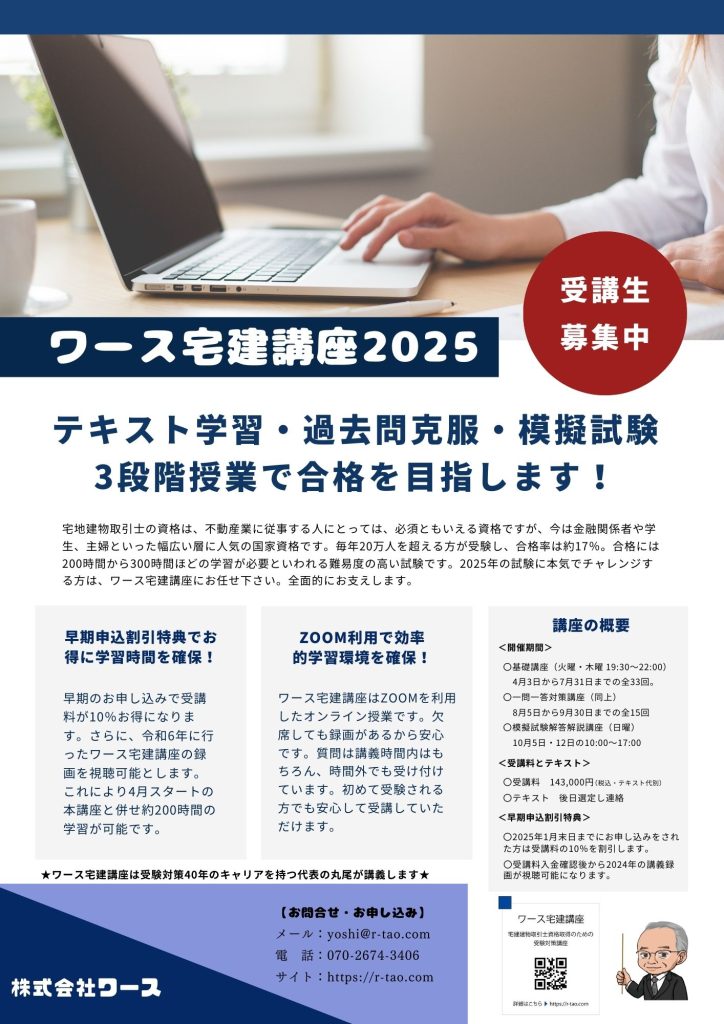 ワース宅建講座2025のご案内 2025 1/10 宅建講座 2025年1月10日 少人数制のワース宅建講座。今年もやりますよ。少人数だから、質問にも答えやすい。しかも、講義中だけでなく、講義後でも基本OK。合格者が口を揃えるのはこの細かな対応。しかもZOOMだから欠席しても録画が視聴できる。これなら急な用事で欠席しても安心です。#宅建 #宅建講座 #福岡の宅建講座 #宅地建物取引士 #宅建試験 宅建講座 ワース宅建塾 ワース宅建講座 宅地建物取引士 宅地建物取引士法定講習会 宅地建物取引士資格試験講座 宅建講座 福岡の宅建講座 よかったらシェアしてね! URLをコピーしました! ワース不動産塾六の組 重説編Ⅱを開講 ワース不動産塾参の組契約編Ⅳ開講 関連記事 宅建講座2017のご案内 2017年2月20日 不動産業の免許と宅地建物取引士の資格 2017年2月21日 アパートオーナーと宅地建物取引業 2017年2月26日 相続した土地を分筆して売ったおじさんの話 2017年3月4日 大臣免許と知事免許 2017年3月8日 天神クラスがスタートしました。 2017年5月12日 2018年に向けた宅建試験対策講座始めます。 2017年9月3日 ワース宅建講座2017、もうすぐ終了です。 2017年10月8日